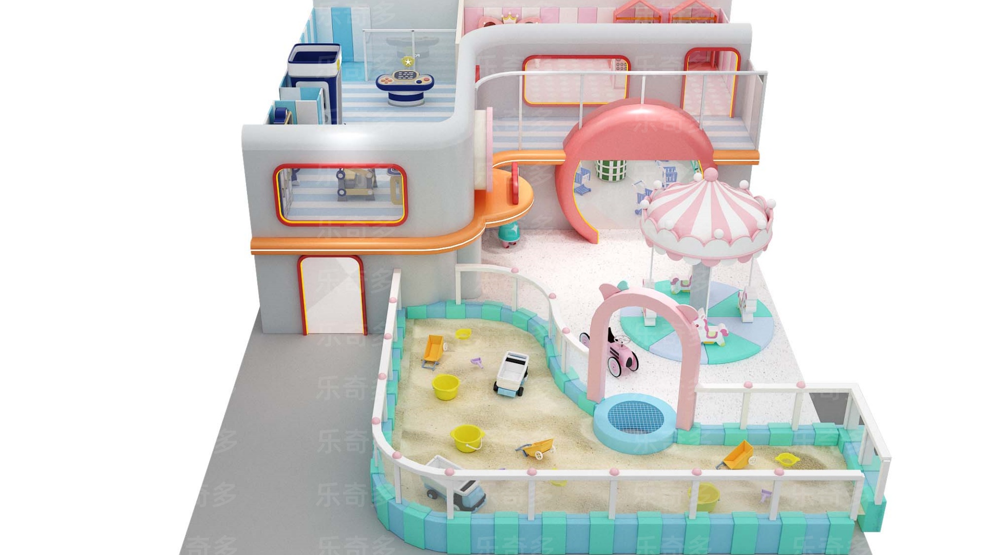 項目玩法:沙池探寶,海洋球池,波浪滑梯,互動投影,組合滑梯,手工區,彈跳迷宮、兒童小蹦床,角色扮演,公主屋,親子餐廳等。